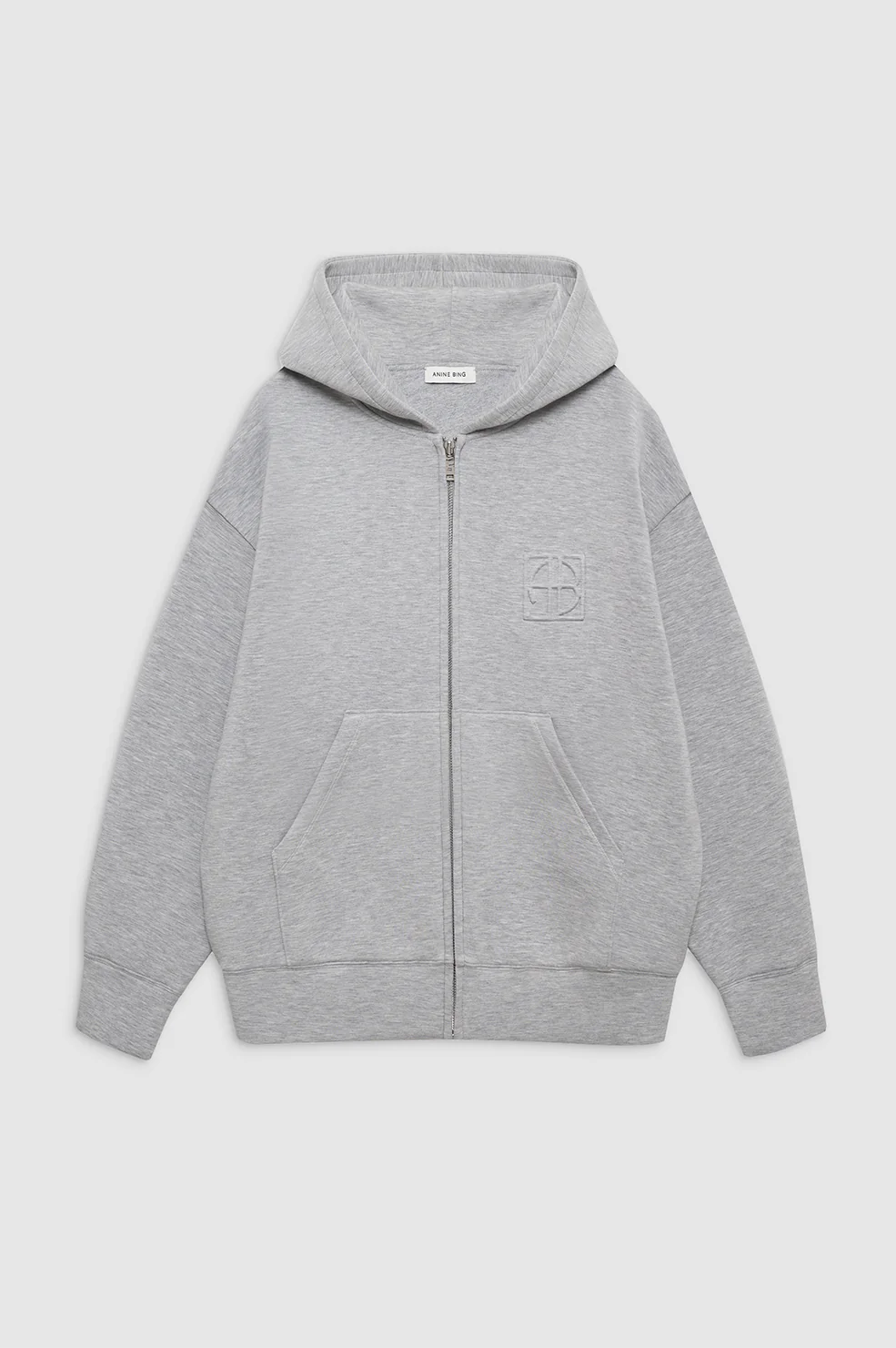 The Bond Zip Up Hoodie Framed Monogram is constructed from a heavyweight scuba fabrication with a slick, soft hand. This elevated yet relaxed casual is fully lined and features dropped shoulders, a branded front zipper pull, and functional kangaroo pockets. Finished with an embossed, framed ANINE BING monogram at the wearer's left chest.
