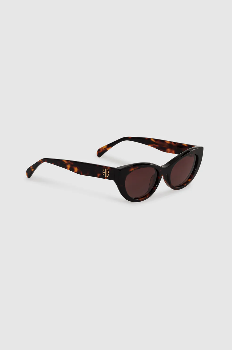 The Cannes Sunglasses feature a rounded, subtle cat-eye shape with square sides made from dark tortoise acetate with brown gradient lenses polarized with UV400 protection. Accented with gold-tone branding at each temple.