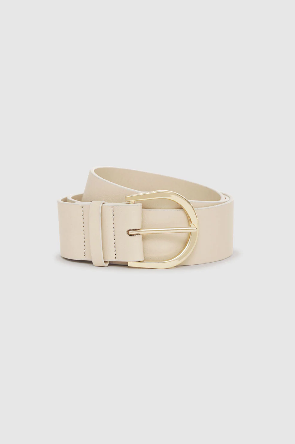 A thick statement belt made from smooth 100% cow leather in beige featuring a curved buckle in gold-tone hardware. Its intentionally long belt strap hangs at the wearer's side for a dramatic look.