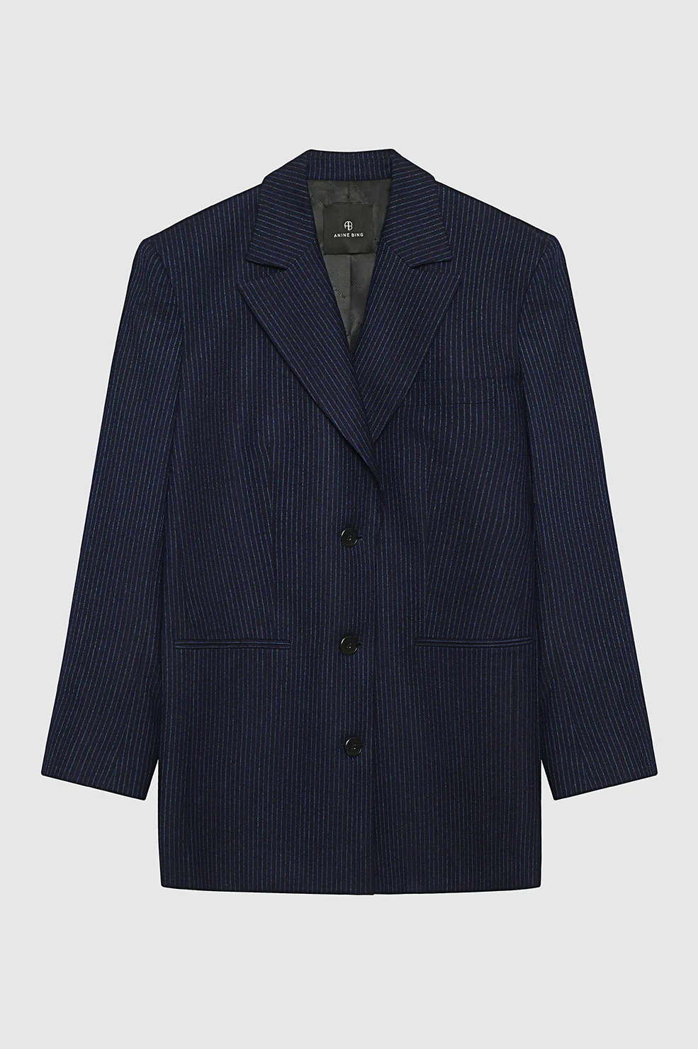 A fully constructed blazer crafted from a midweight, brushed pinstripe flannel, featuring a fashion oversized fit with a broad shoulder, notched collar, and single-breasted, three-button closure.