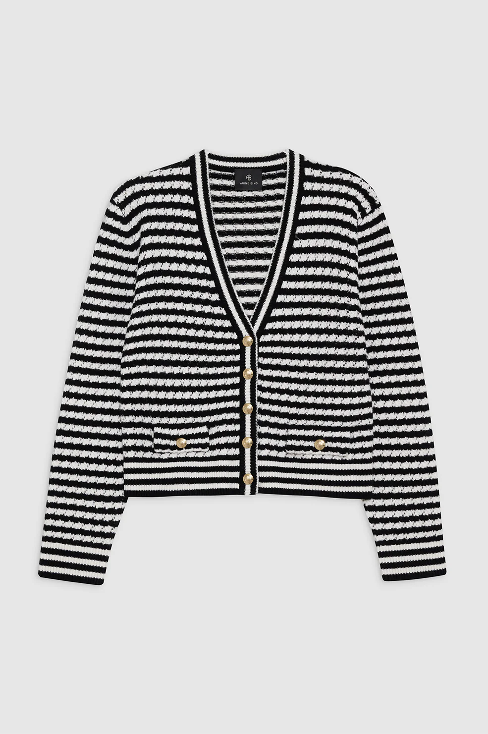 An elevated pointelle sweater crafted in a midweight, striped wool-cashmere blend. The Gwen Cardigan features a V-shaped neckline, two functional flap pockets, decorative gold buttons with ANINE BING engraving at the center front, and contrast ribbed trim at the neckline, placket, cuffs, and hem. Finished with a small hand-tacked ANINE BING monogram charm.