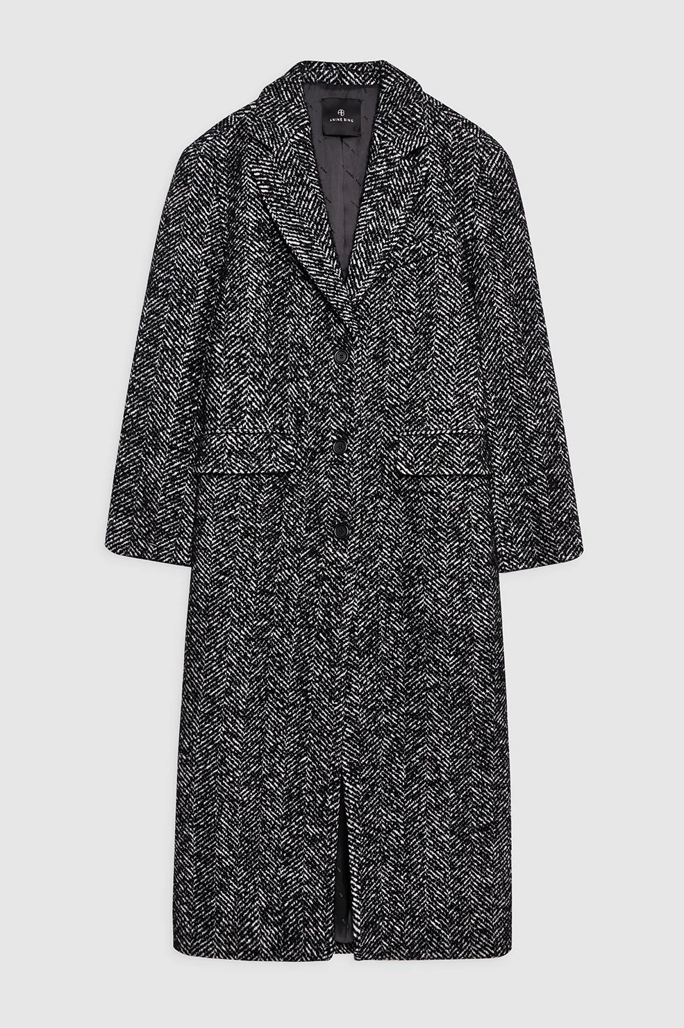 Inspired by the best-selling Quinn Blazer from the Classics Collection. The Quinn Coat is made from a heavyweight wool blend with a soft hand and herringbone texture. Intentionally boxy and oversized with shoulder pads, this menswear-inspired layer features a single-breasted closure with three buttons, one welt pocket at the wearer's left chest, and two flap pockets at the hips.