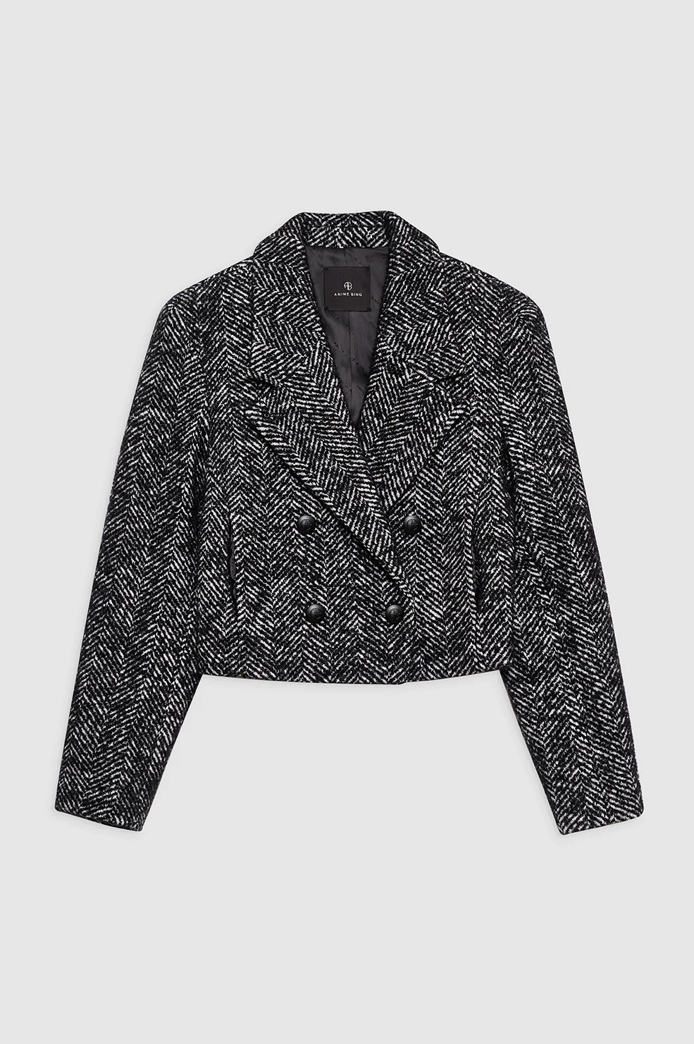 A constructed blazer in a heavyweight, herringbone wool tweed, featuring a fashion cropped fit, notched collar, and double-breasted closure with four buttons.